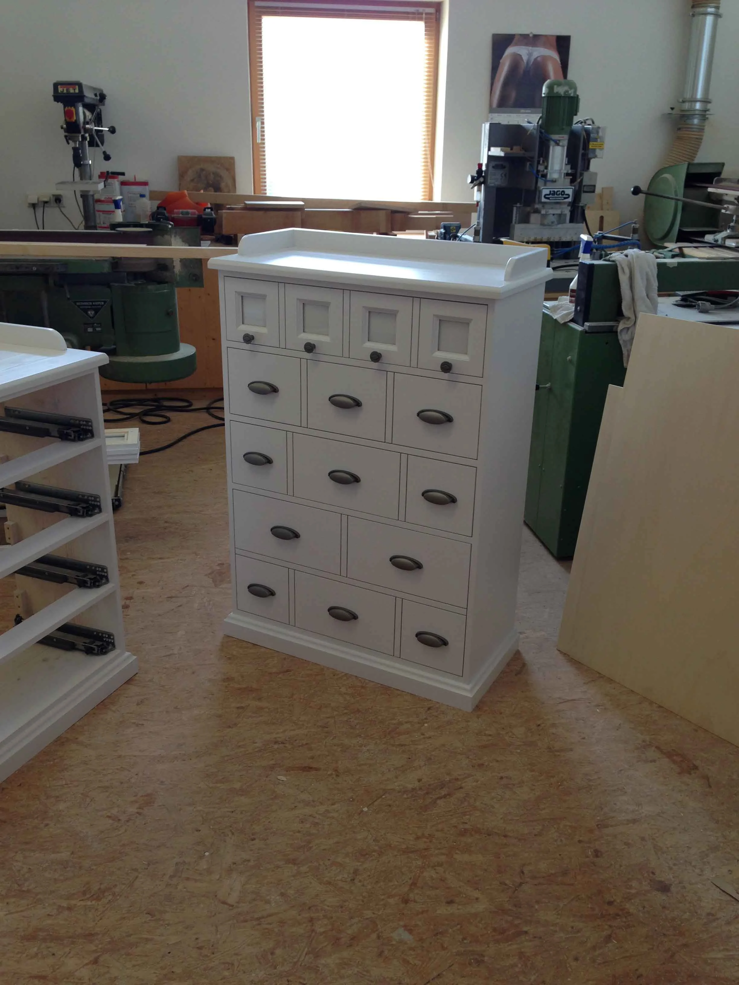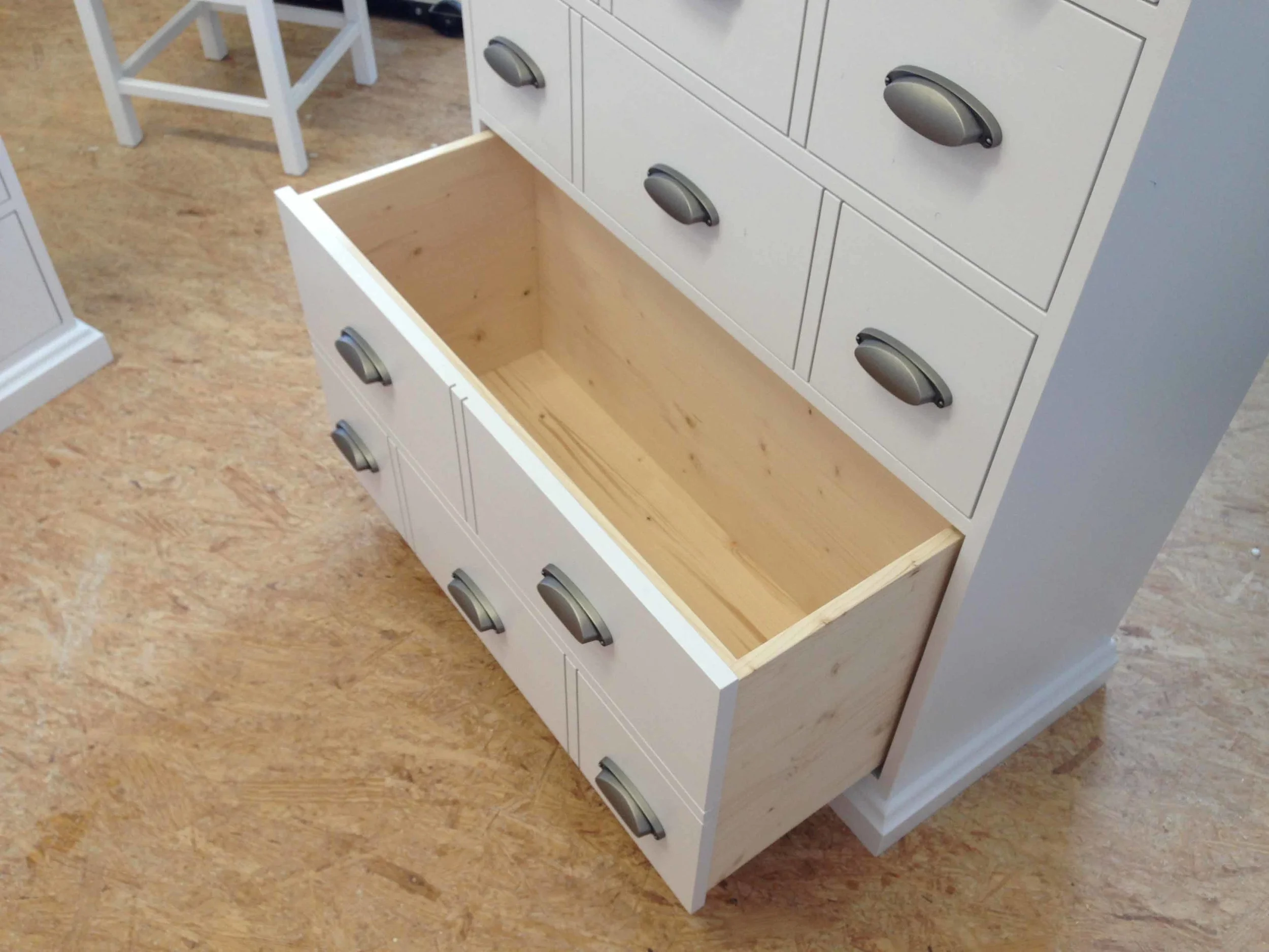 Zwei Kommoden für das Bad nach klassischem Vorbild. Die vielen kleinen Schubladen sind nur vorgetäuscht. Hier wurden nur die Fronten unterbrochen, dahinter verbergen sich große, leichtgängige Schubladen mit Soft-Einzug.