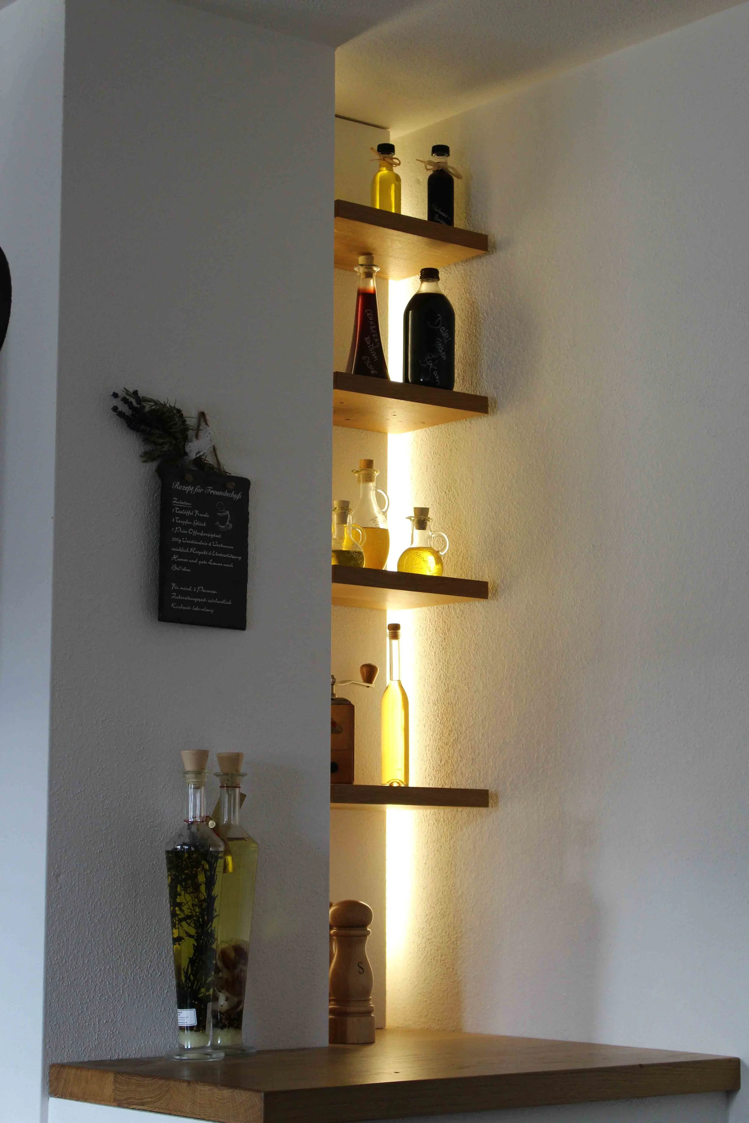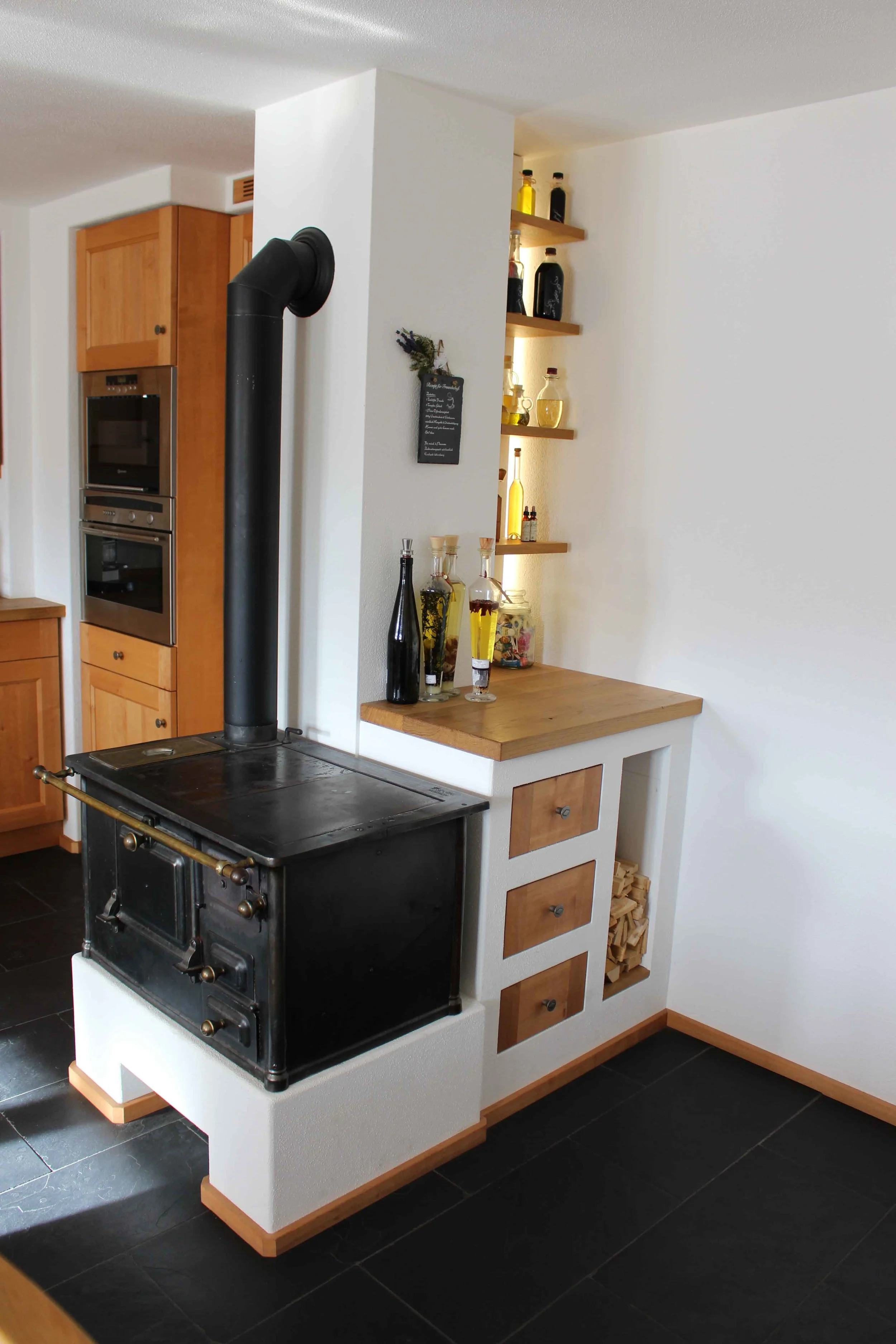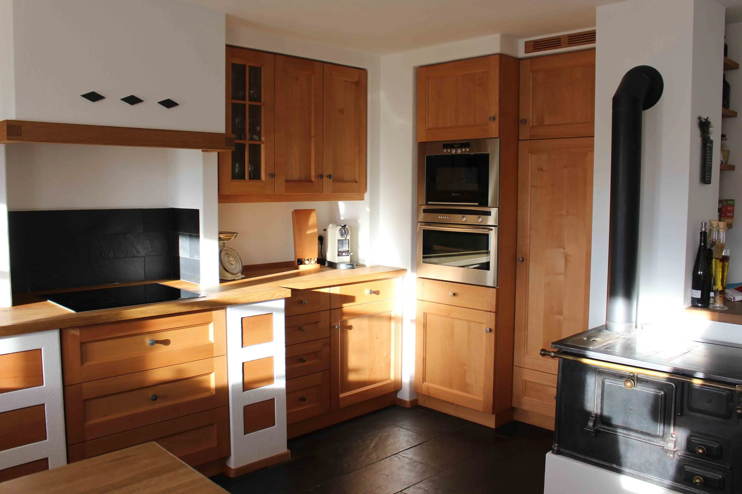 Das Besondere an dieser Küche sind die "gemauerten" Elemente. Diese wurden komplett aus Gipsfaserplatten in der Werkstatt gefertigt und mitsamt der eigentlichen Küche montiert. Viele praktische Details wie elektrisch unterstütze Schubladen, sinnvolle Arbeitsplatzbeleuchtung mit Sensorleiste zum ein-/ausschalten oder auch eine integrierte Ladestation fürs Handy zeichnen diese Küche aus.