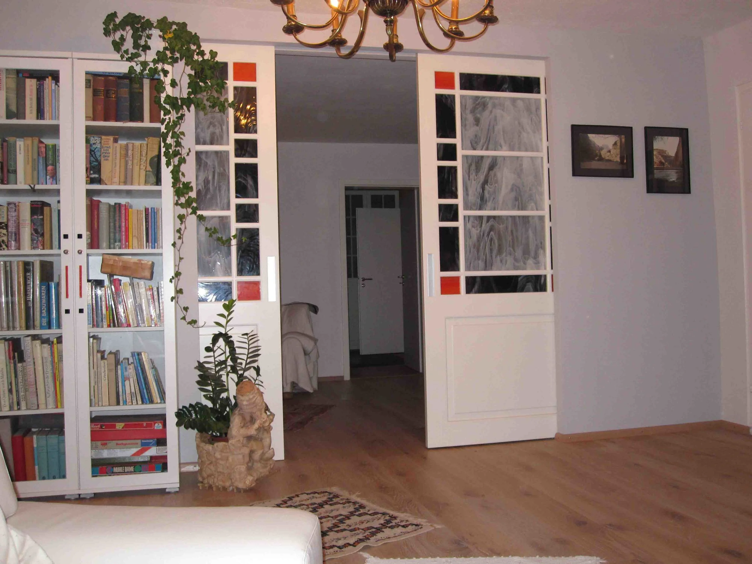 Nachträglich eingezogene Trennwand in Trockenbauweise. Die Schiebetüren sind weiß lackiert und mit exklusiven Gläsern versehen.