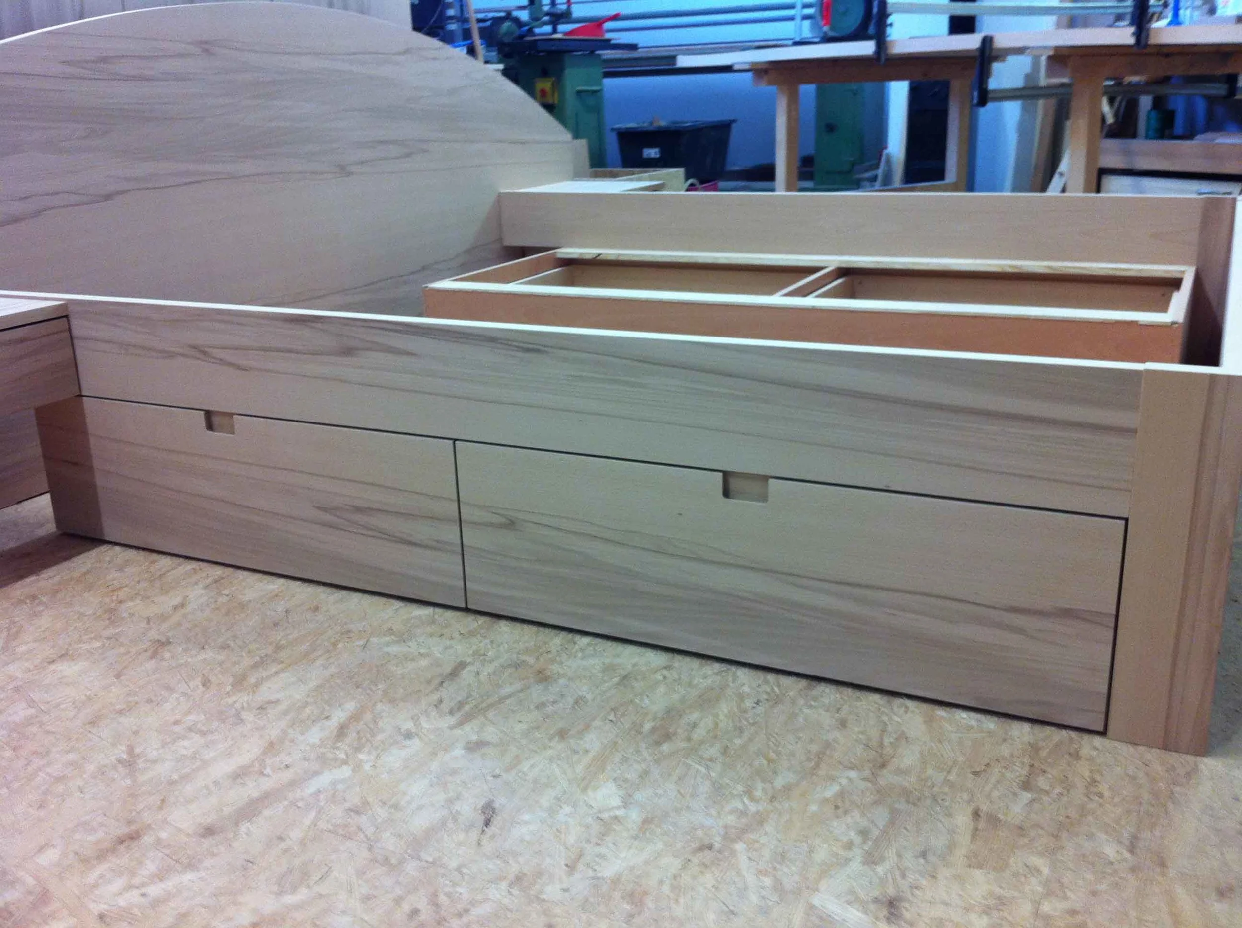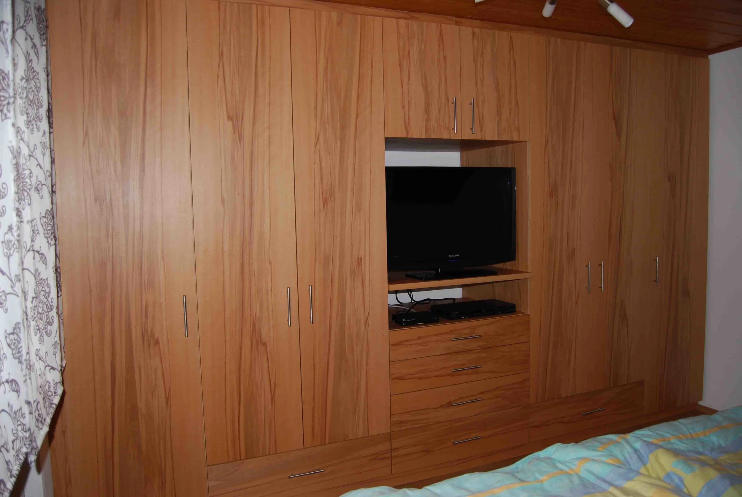 Dieses Schlafzimmer bietet sehr viel Stauraum. Ein extra tiefer Schrank mit großen Schubladen sowie weiteren Schüben im Bett stecken einiges weg. Ein Fernseher durfte nicht fehlen.