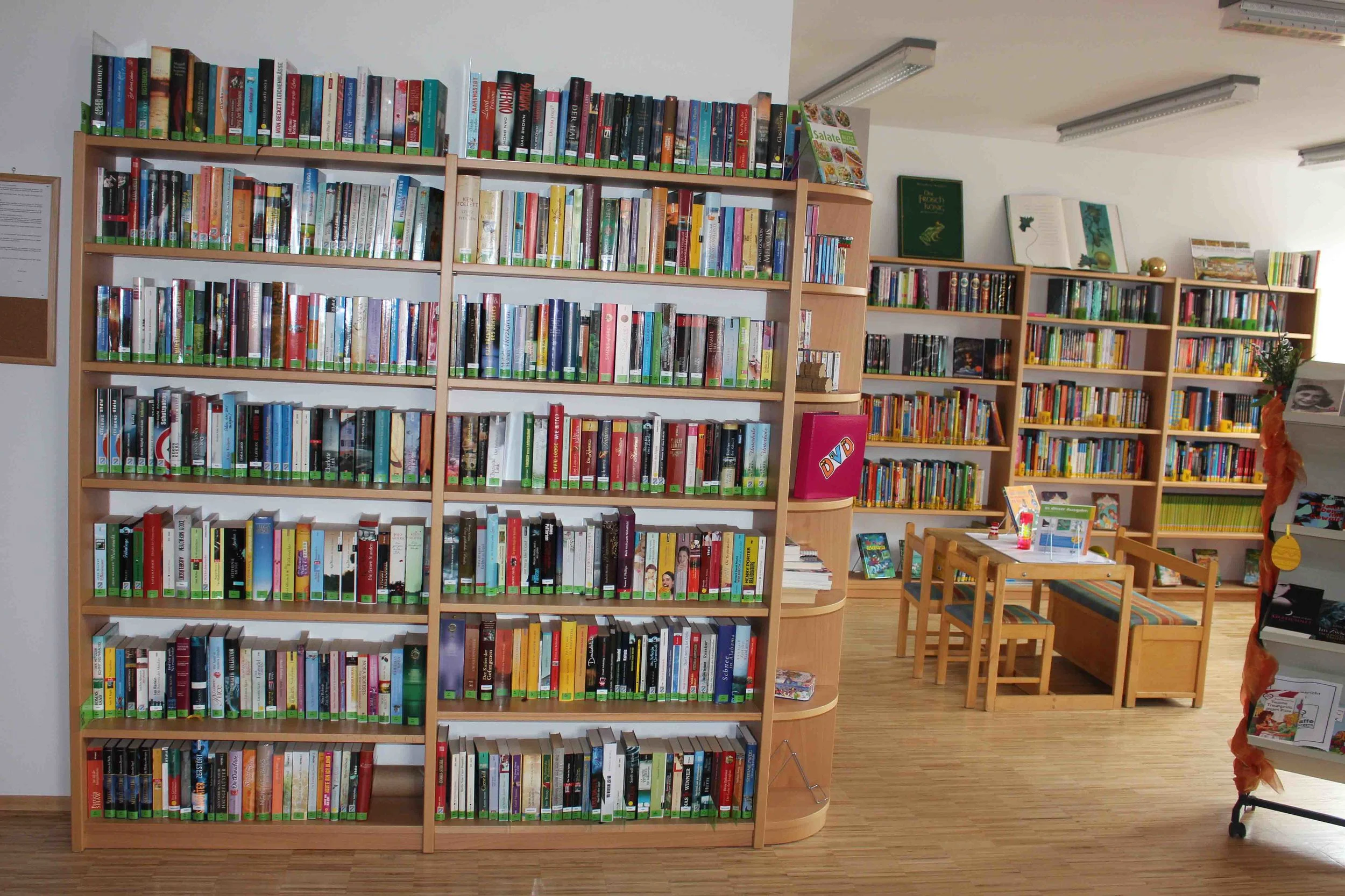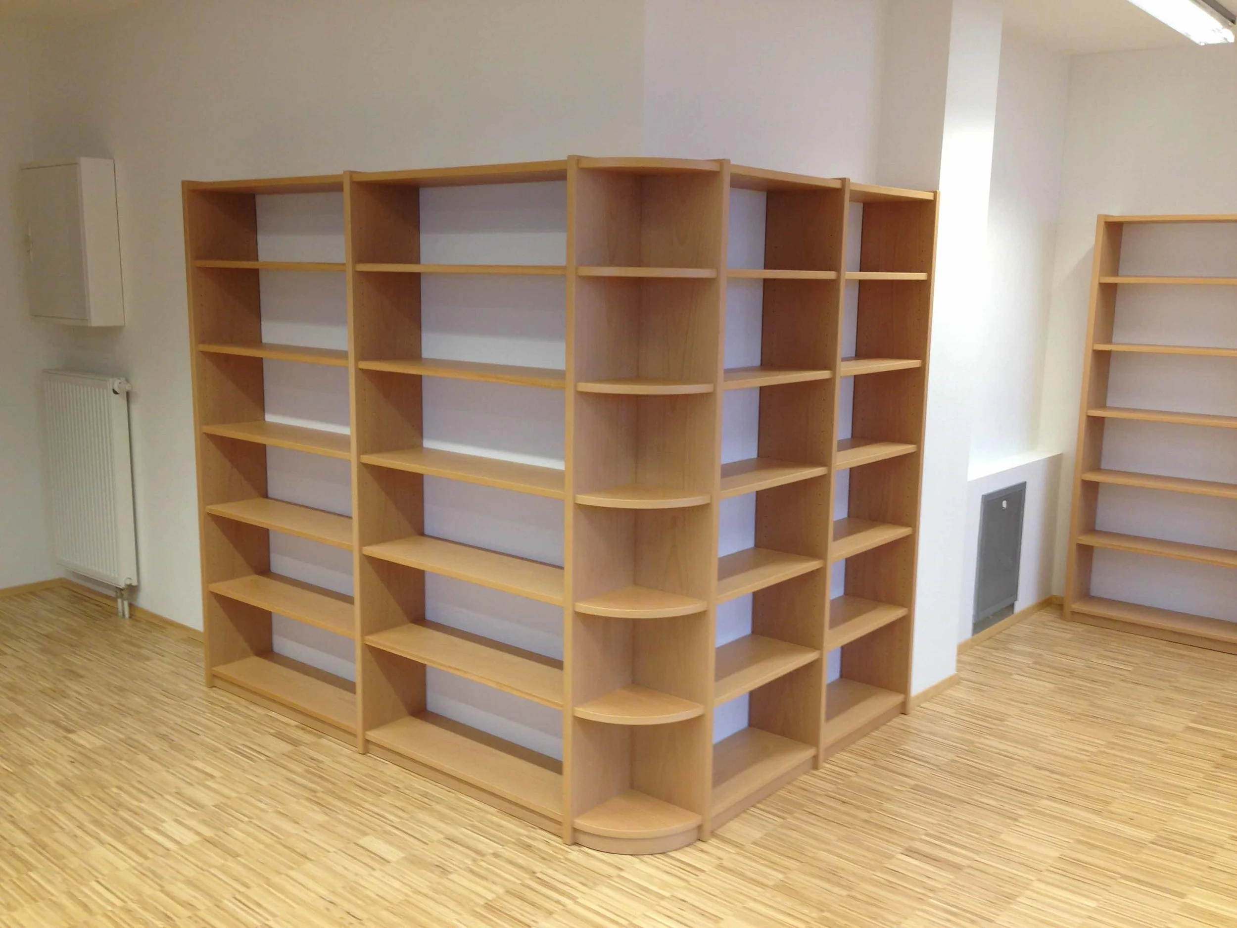 Schlichte Regale in Buche lackiert. Die furnierten Böden aus Stäbchenplatte halten trotz der Länge dem hohen Gewicht der Bücher stand.