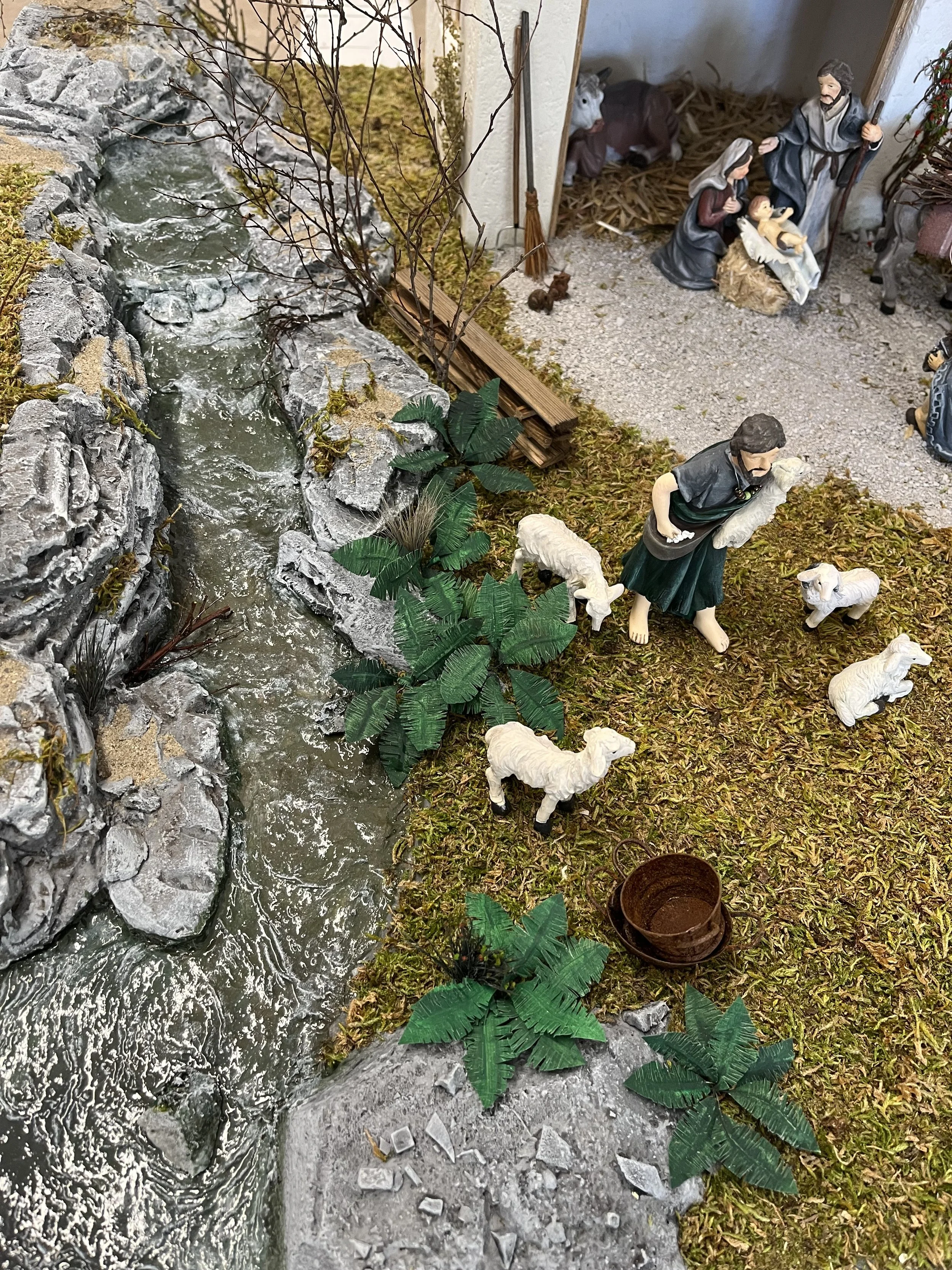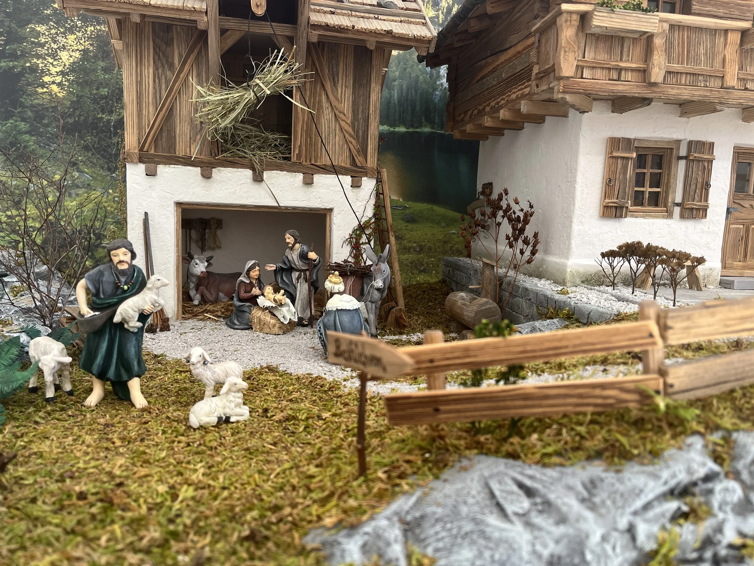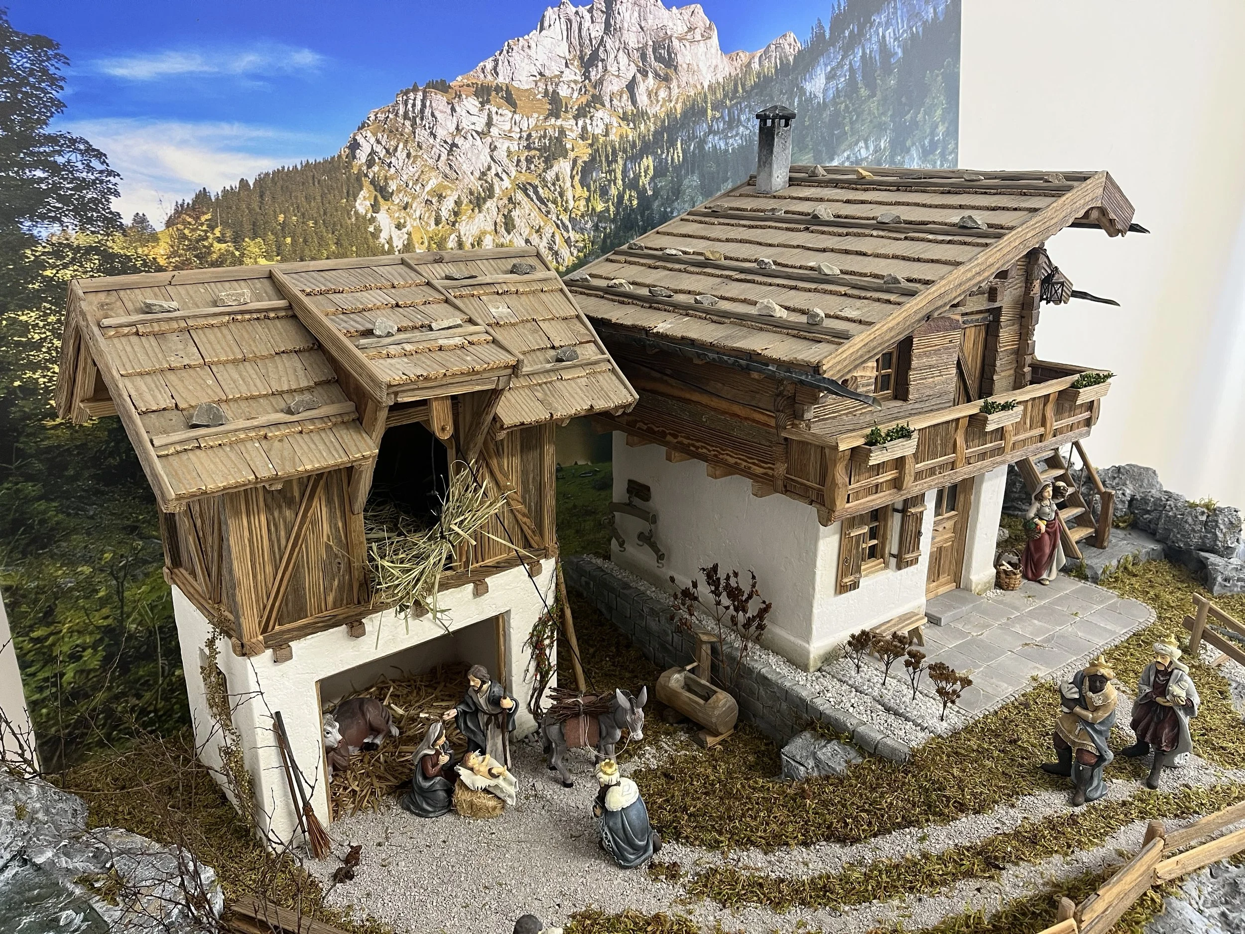 Krippe im alpenländischen Stil. Grundplatte ca. 120/70 cm. Für 10 cm Figuren gefertigt.